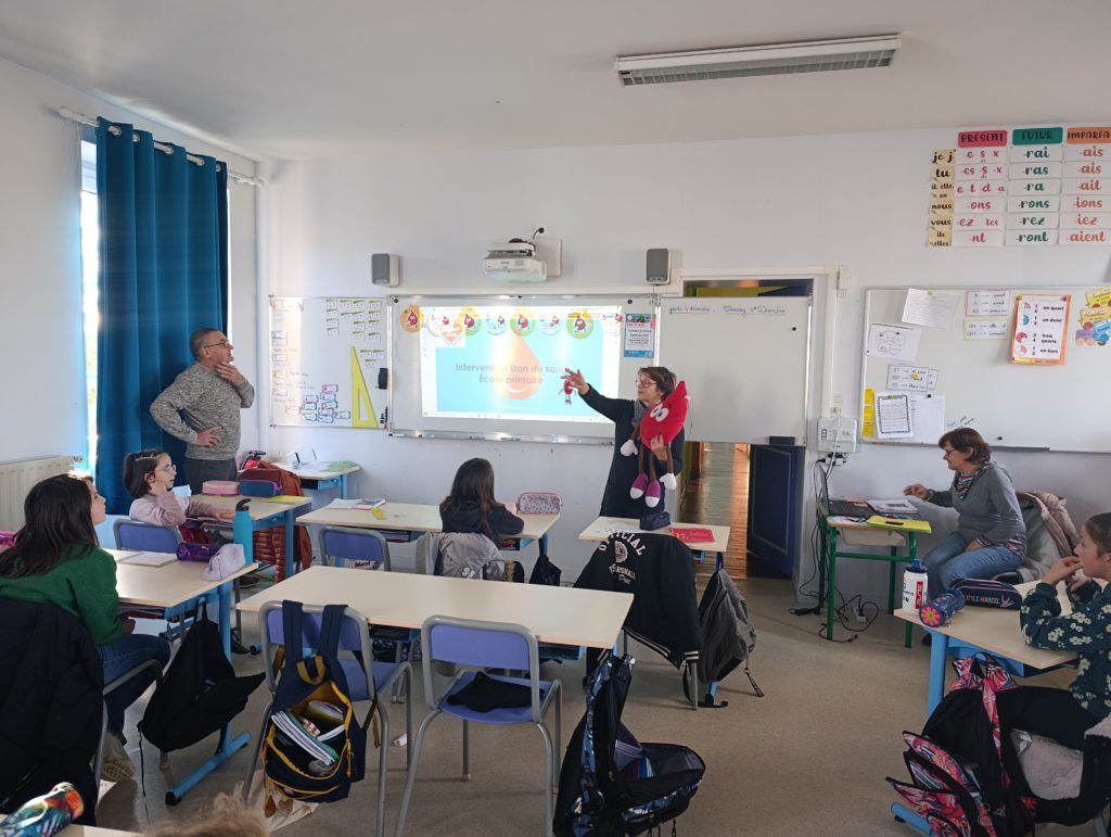 3 bénévoles au don du sang sont venus à l’école pour expliquer aux élèves (CM1/CM2) ce qu’était le don du sang et comment il se déroulait.